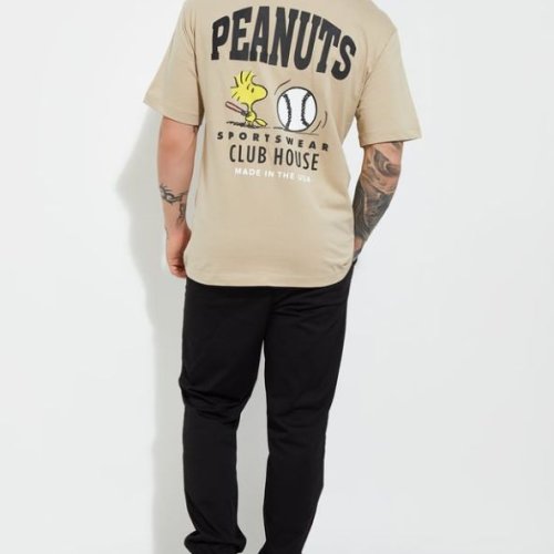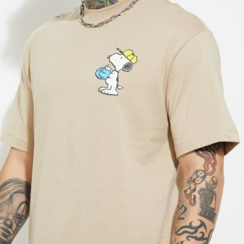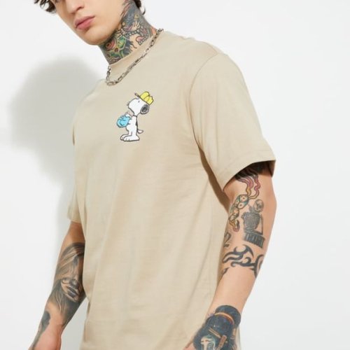 Mens Beige Round Neck Cotton Printed T-Shirt