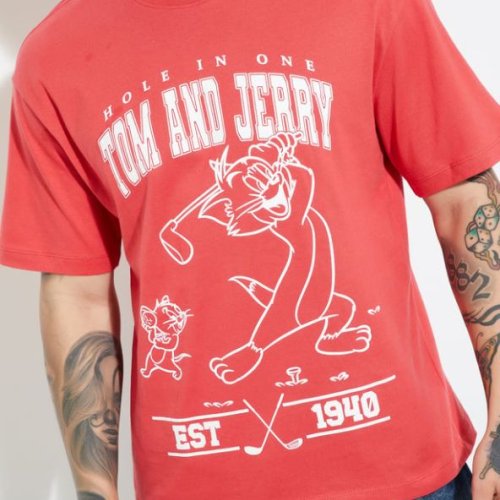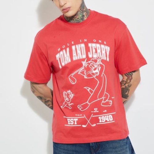 Mens Red Toma Nd Jerry Pritned Cotton Round Neck T-Shirt